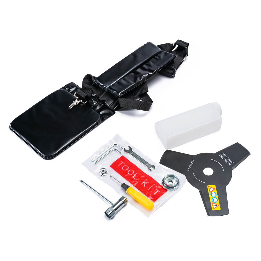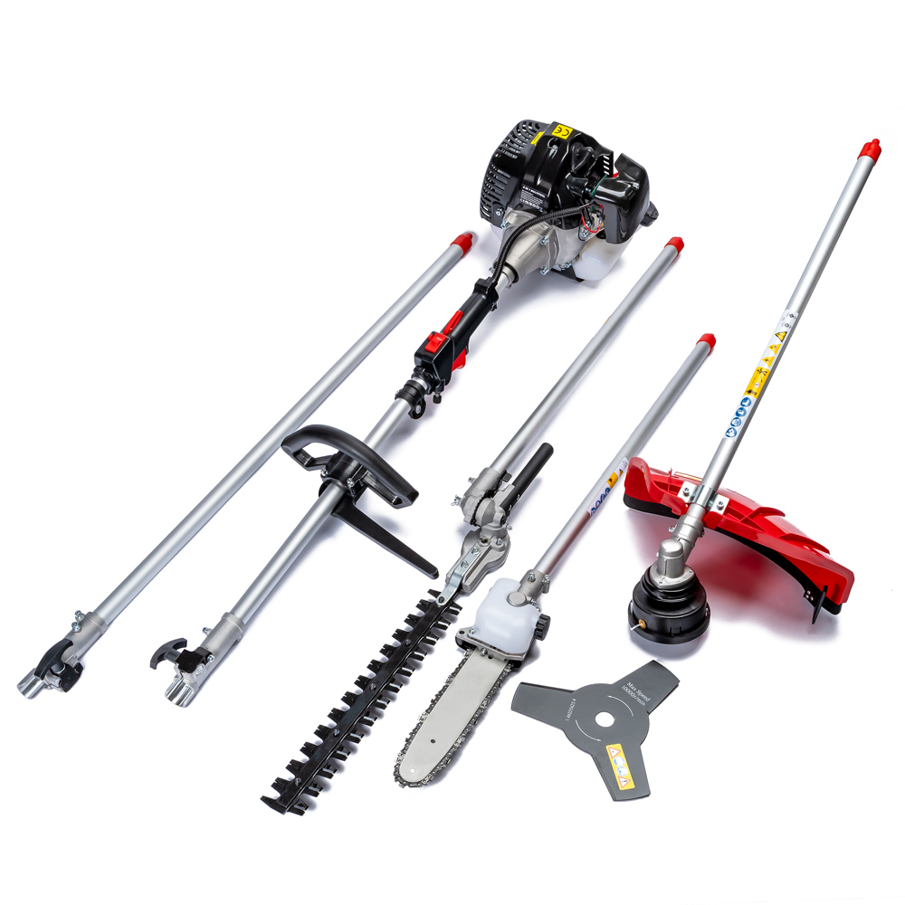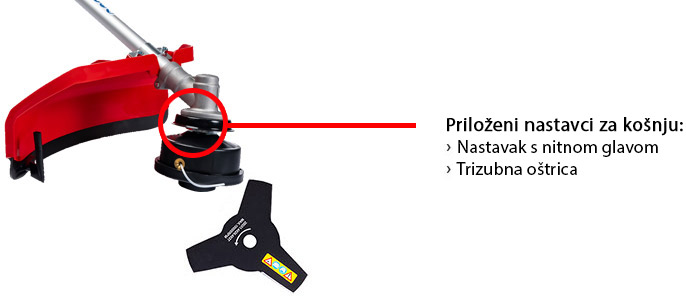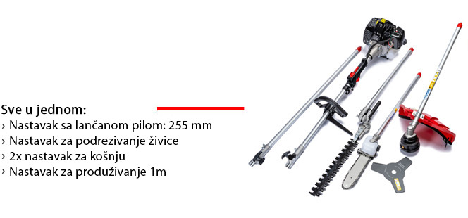 - 5 nastavaka: trizuba oštrica, nastavak s nitnom glavom, nastavak sa lančanom pilom, nastavak za podrezivanje živice, nastavak za produživanje