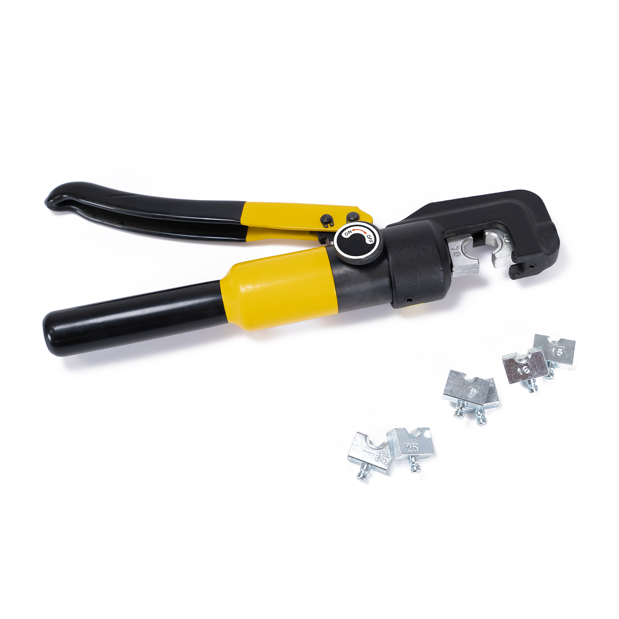 Snažna hidraulička kliješta za stezanje prikladna za stezanje krajeva kabela. Dolazi sa 7 dodataka u praktičnoj torbici.